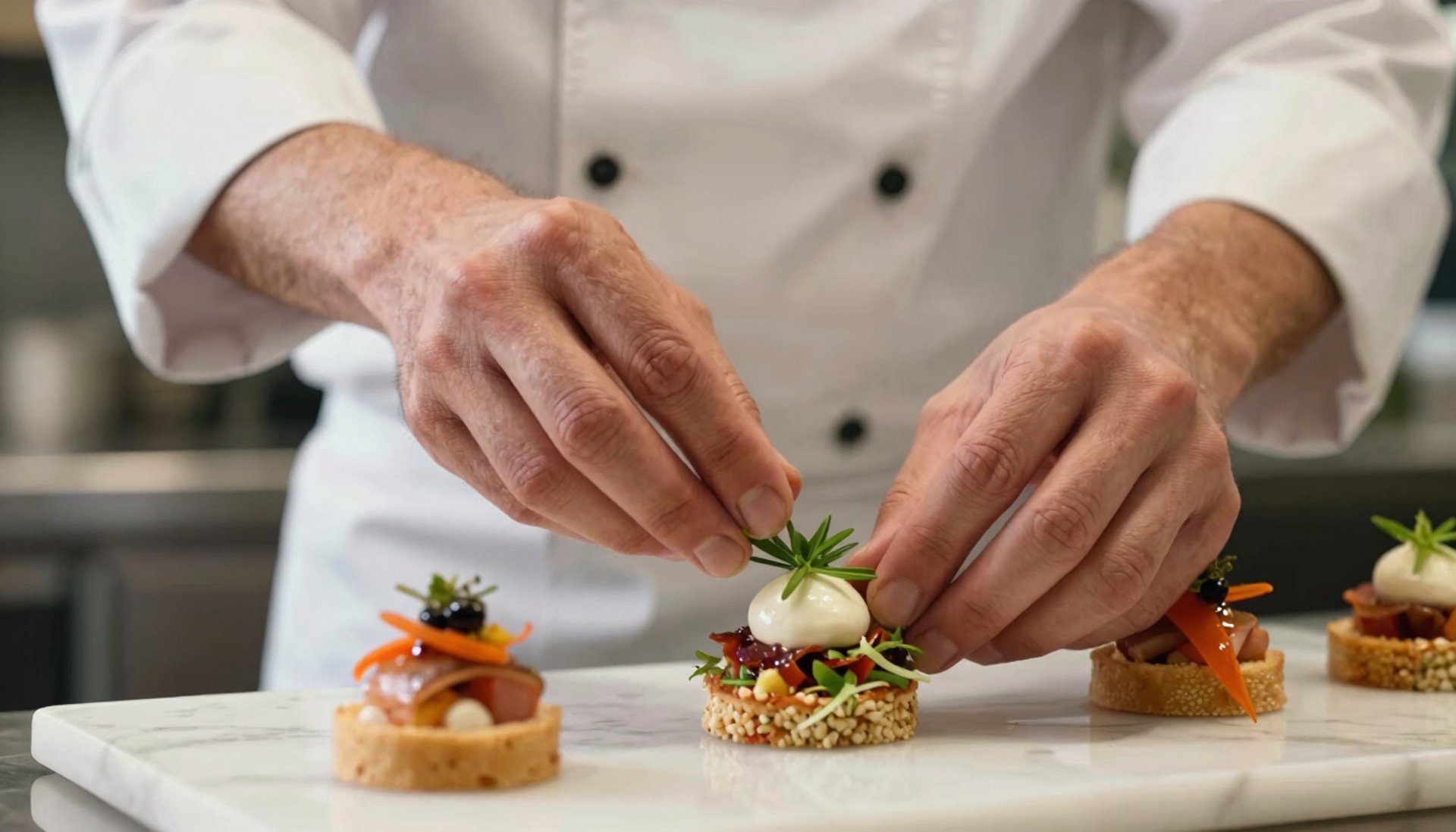 Privilegiamos ingredientes sazonais e de produtores locais para garantir a máxima frescura. Cada prato é uma celebração da cozinha mediterrânica, apresentada com uma estética moderna e elegante que surpreende os sentidos e encanta os convidados em qualquer recepção de prestígio.
